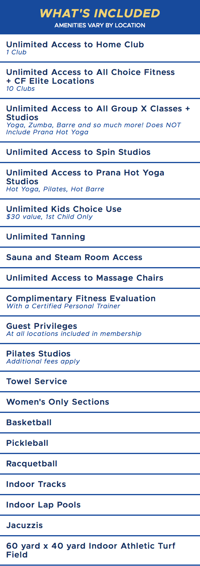 AMENITIES VARY BY LOCATION